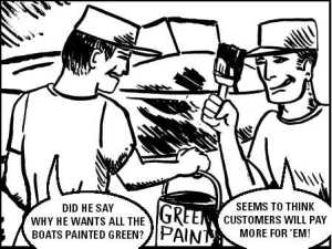 What are you doing to be green? Are you using less paper? Do you offer preferred parking to employees who carpool? Do you have timers on your lights? Are you buying in bulk? Using local oil and fluid recovery services? Taking the back lighting bulbs out of the vending machine? Promoting portable engine flushing bags? Putting soybean ink in the printer? Staying up on financial incentives offered to clean business in your State and local regulatory agencies? Buying sustainable, recycled, refurbished or used? Putting a bike rack at the Marina? Getting an energy audit from your State or utility company? Are you keeping doors closed and insulating better?